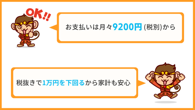 初回のお支払いのみ13,289円(税込14,618円)からとなりますが、その後のお支払いはずっと月々9,200円(税込10,120円)からとなります。